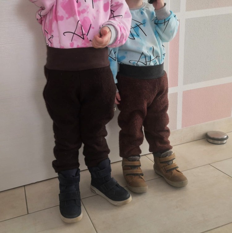 Die Hose besteht aus 100% Schurwolle, Bauch- und Beinbündchen aus 95% Baumwolle, 5% Elasthan.