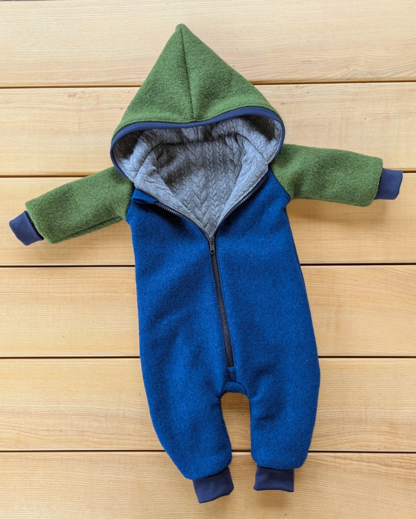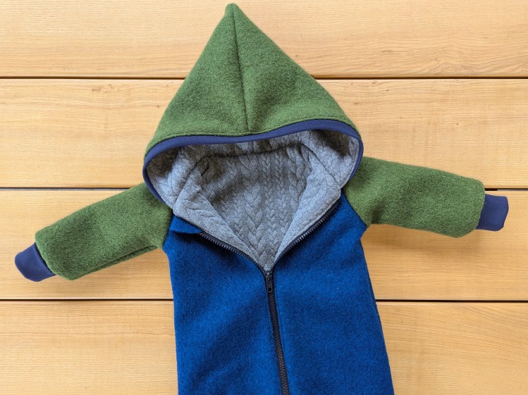 Der Overall mit Reißverschluss ist innen komplett mit einem Zopfstrickstoff gefüttert, bei Ärmel und Beinen sind Umschlagbündchen.